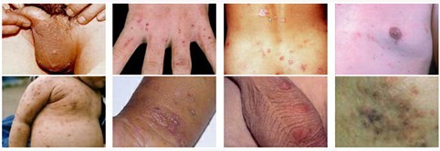 初起皮疹多见于皮肤潮湿柔软处,如手指间、手腕部位的皮肤容易寄生,继之传播到身体其他部位,如肘、腰部、腋窝、腹部及阴部等处。
